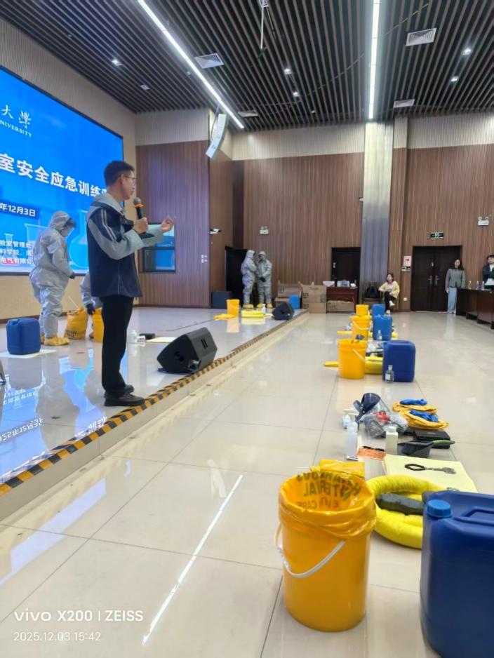 培训采用“理论授课+案例分析+实战演练”的立体化培训模式,4名有专业技能的志愿者组成示范引导小组,全程指导各学院参训学生团队,确保培训内容的专业性与实用性。“之前在实验中遇到小的试剂溅洒时有些慌乱,通过这次系统培训,能真正学会科学规范的处置方法。”参训代表期待通过应急训练学到更多实战经验。