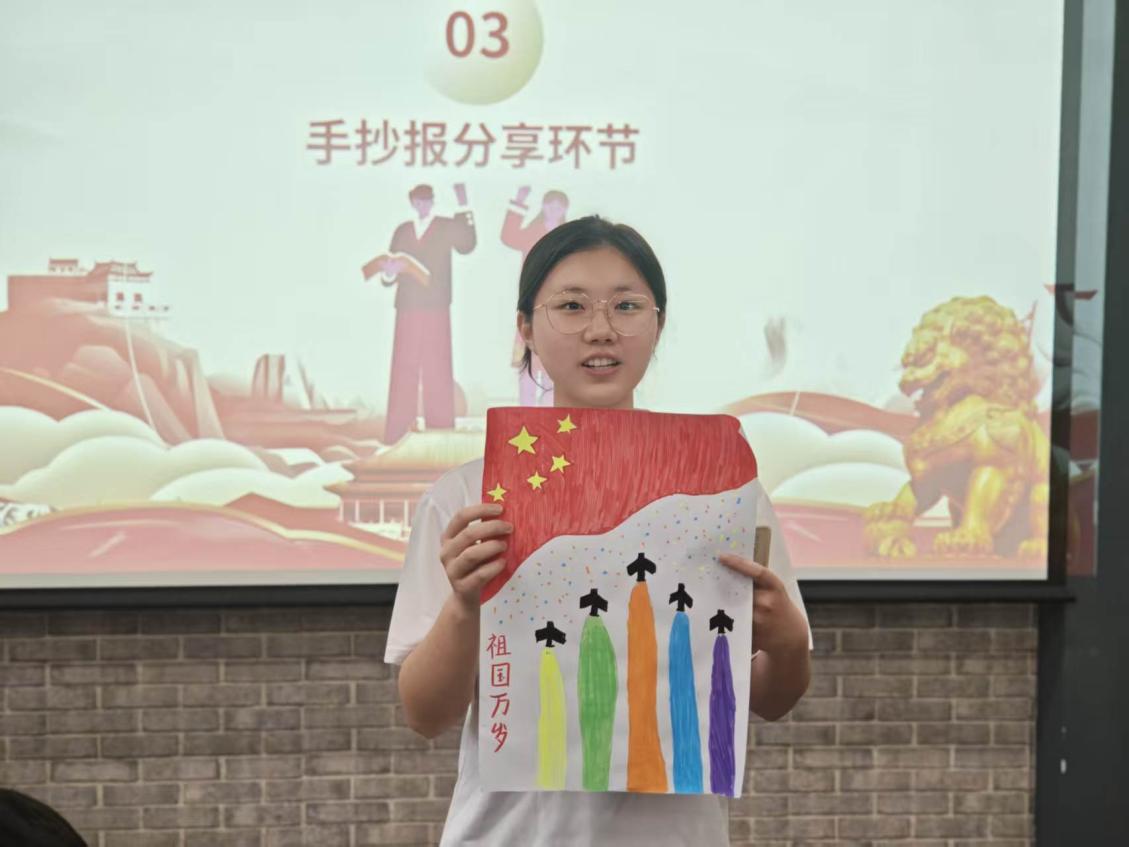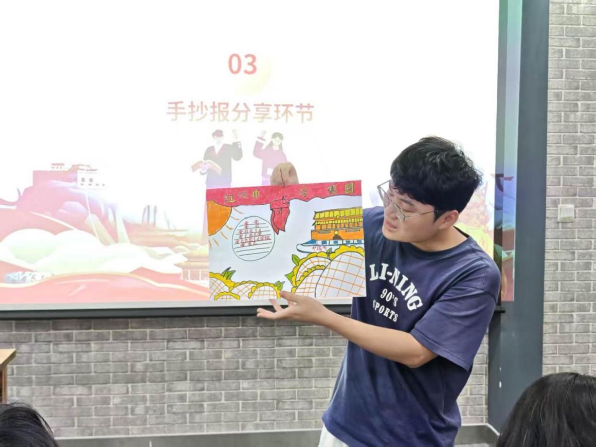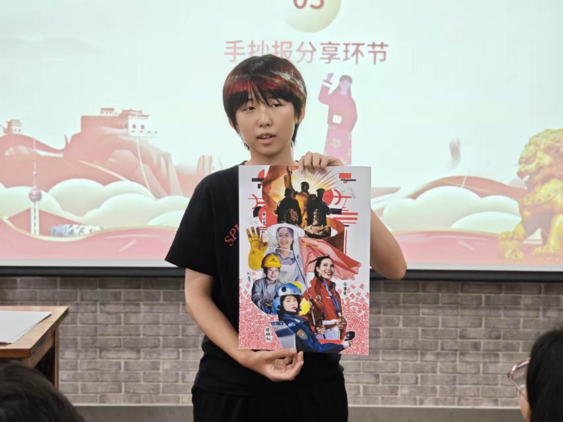 随后,各小组代表依次上台展示并讲解作品内容,分享创作思路与学习感悟。精彩的展示赢得阵阵掌声,现场互动频繁、氛围活跃。活动最后,田春老师和周大淇老师对同学们的表现给予充分肯定,并寄语大家将学习成果转化为实际行动,把爱国之情落实到学习与生活中,在实干中不断提升自我、服务社会。