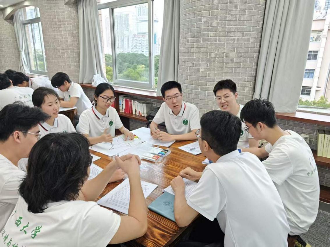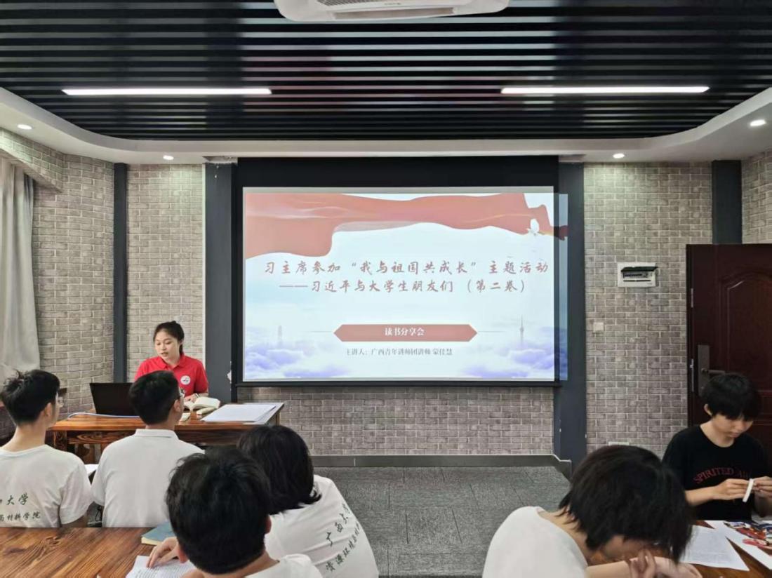 活动伊始,马克思主义学院蒙佳慧同学担任领学人,带领与会同学共同学习《习近平参加 “我与祖国共成长” 主题活动》相关篇目。她结合自身成长经历分享学习体会,深刻感悟国家发展为青年成长成才提供的广阔舞台,并在实践中不断深化对时代使命的理解。在校期间,蒙佳慧同学积极投身理论宣讲,光荣加入 “80、90、00 后” 广西青年讲师团,以青春之声讲好中国故事、传播时代强音。她在发言中表示,新时代青年要自觉将个人理想融入国家发展大局,在与祖国同心同向、同行奋进中实现人生价值。真挚质朴的分享,引发在场同学深深共鸣。