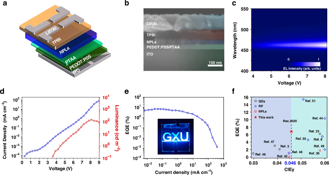 金属铅虽然未列入广西关键金属,但其也是广西的重要特色金属,其资源丰富,与许多广西关键金属如锡、锑等在矿物中共存或伴生;近年来它作为新型离子型半导体—卤化物钙钛矿材料的核心元素在光电技术领域大放异彩。 钙钛矿发光二极管(PeLED)因其优异的色纯度和高发光效率,被视为下一代显示技术的理想候选。尽管红光和绿光PeLED的外量子效率(EQE)已突破20%,深蓝色PeLEDs的发展仍面临严峻挑战和困难。国际电信联盟Rec.2020标准对蓝色的色坐标提出了极为严苛的要求(CIE-y ≤ 0.046)。然而,传统混合卤化物钙钛矿因卤素空位缺陷和相分离问题,难以同时实现高效率和高色纯度。胶体CsPbBr3纳米片(NPLs)凭借其量子限域效应和各向异性能隙调控,可实现窄带深蓝发光,被认成是解决该难题的理想材料。 但其表面缺陷和配体的不稳定性仍会造成严重的非辐射复合过程,制约了其LED器件性能的进一步提升。