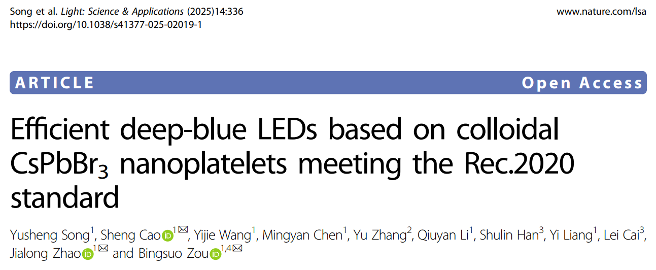 近日,肉视频邹炳锁教授领衔的纳米光子学材料与技术团队在深蓝光发光器件研究领域取得新进展。相关成果以“Efficient deep-blue LEDs based on colloidal CsPbBr3 nanoplatelets meeting the Rec.2020 standard”为题,发表在国际顶尖Nature学术期刊子刊Light: Science & Applications上。邹炳锁教授与物理科学与工程技术学院曹盛、赵家龙为共同通讯作者,广西大学为论文的第一单位及通讯单位。